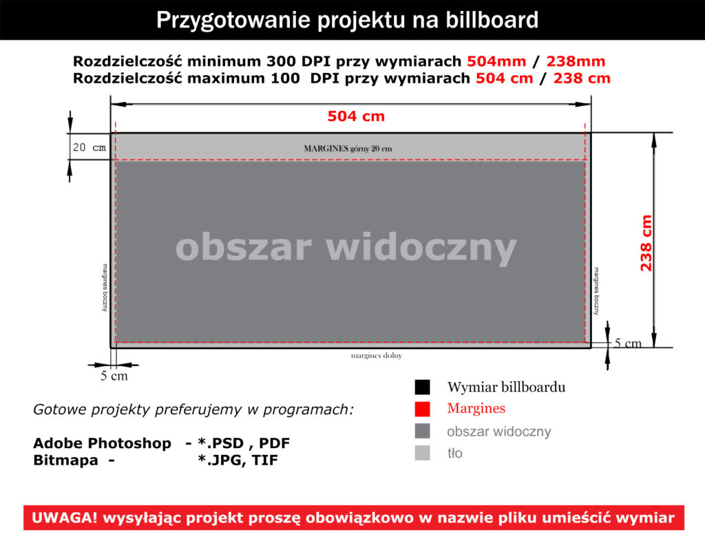 Wielkość reklamy billboardowej dopasowana jest do nośników, które w przypadku Vixon Media mają rozmiar 5.04 x 2.38m (powierzchnia 12m2) oraz 6 x 3m (powierzchnia 18m2). Przed dostarczeniem projektu otrzymasz od nas specyfikację dla swojego grafika, dzięki której przygotujesz projekt.